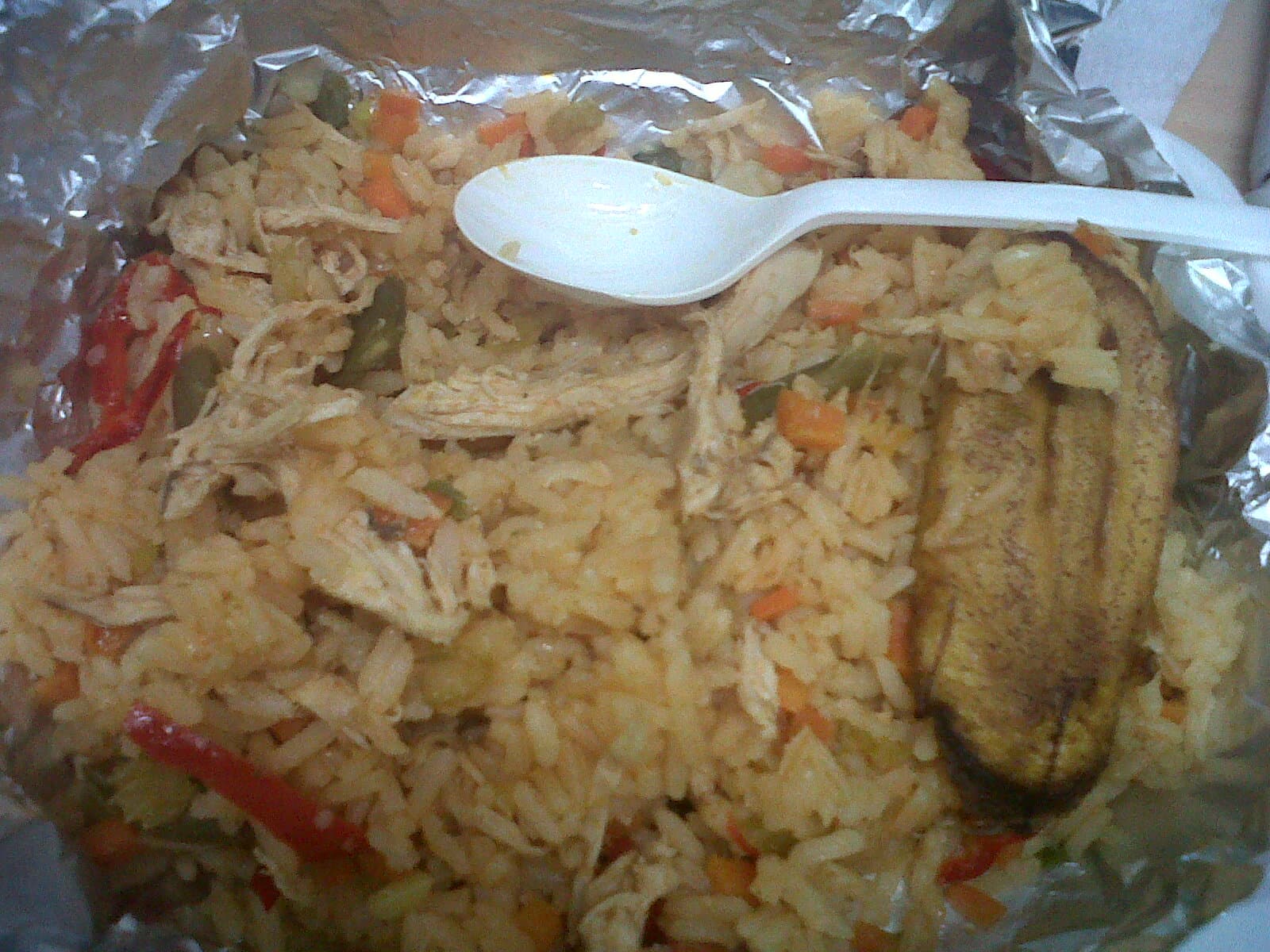 The Sunday classic: yellow rice, peas, peppers and a whole chicken from the carnicería counter.